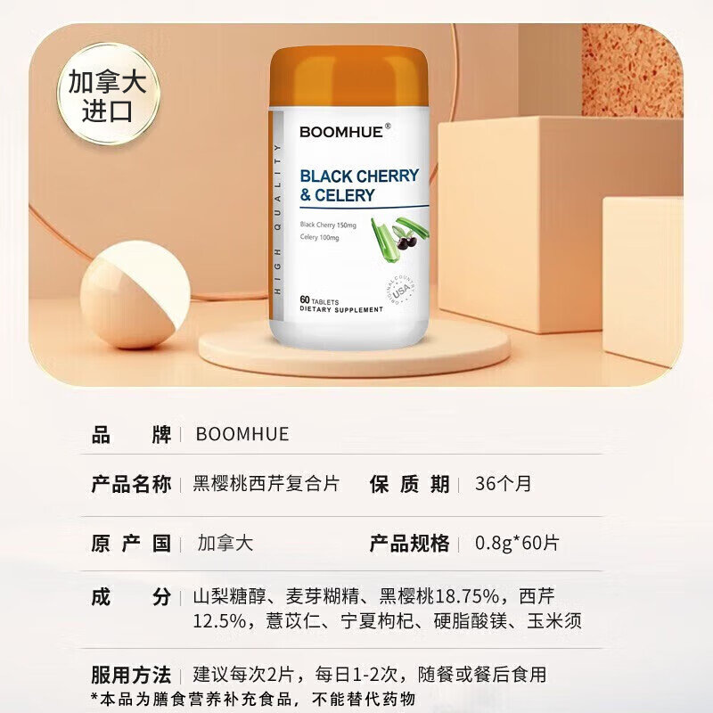 • 商品名称:【完税进口】加拿大 博唤 (BOOMHUE)黑樱桃西芹复合片 60粒/瓶
