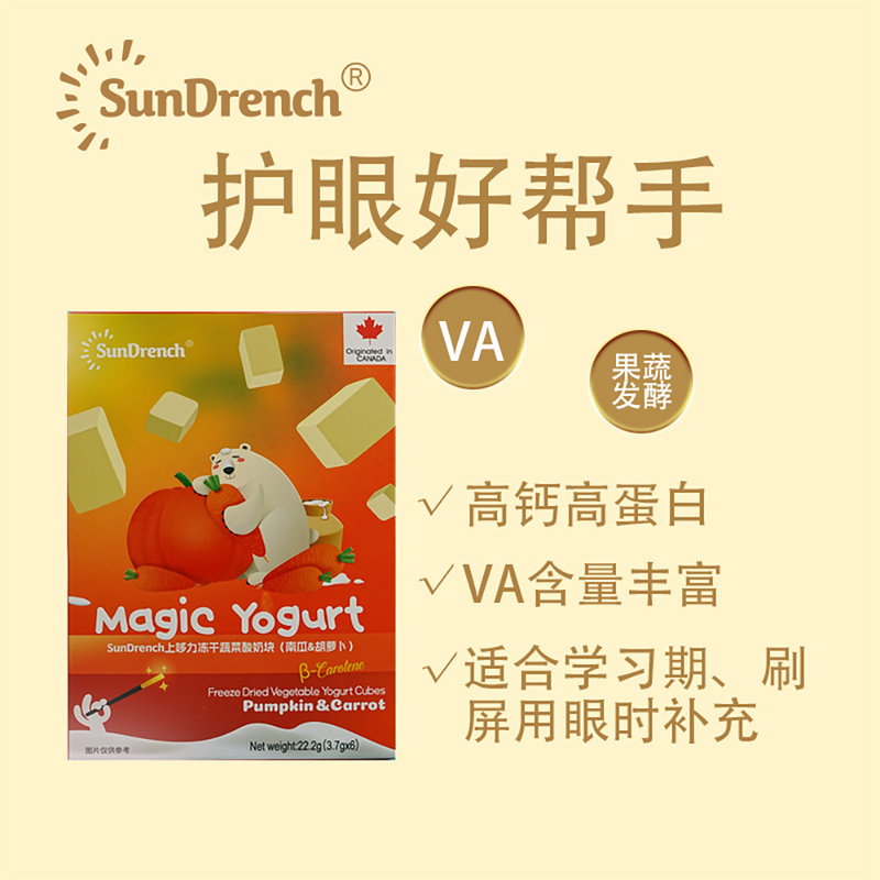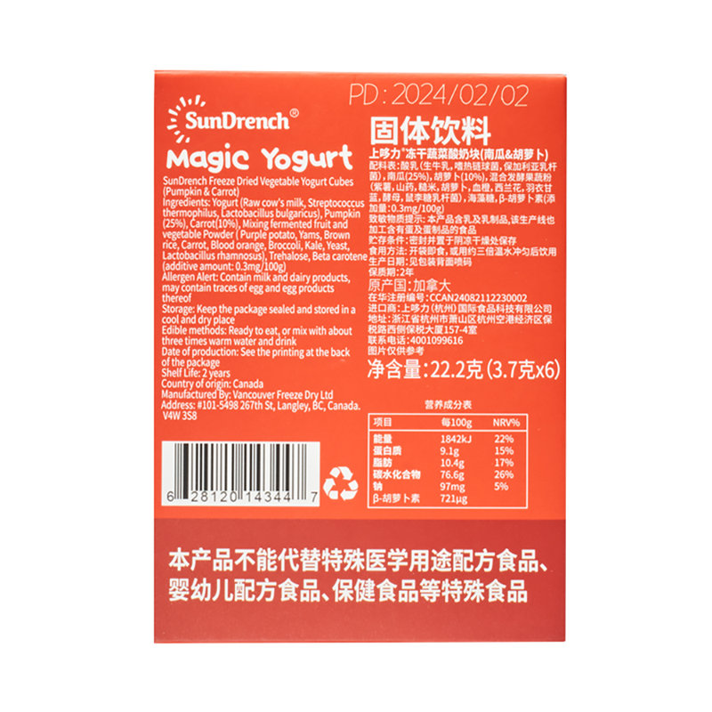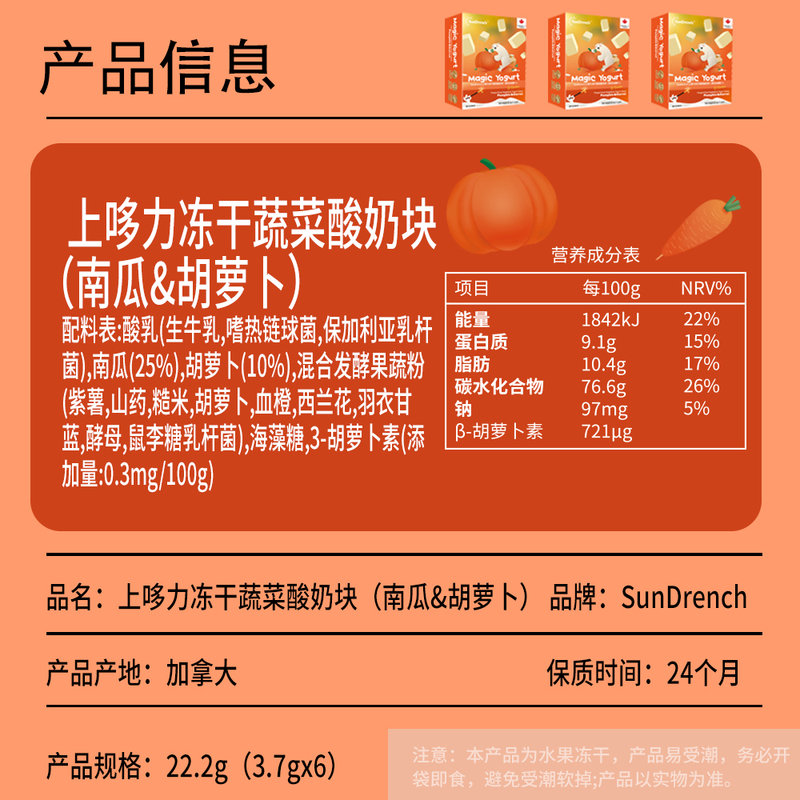 • 商品名称:【完税进口】加拿大 上哆力 SunDrench 冻干蔬菜酸奶块(胡萝卜&南瓜)22.2g